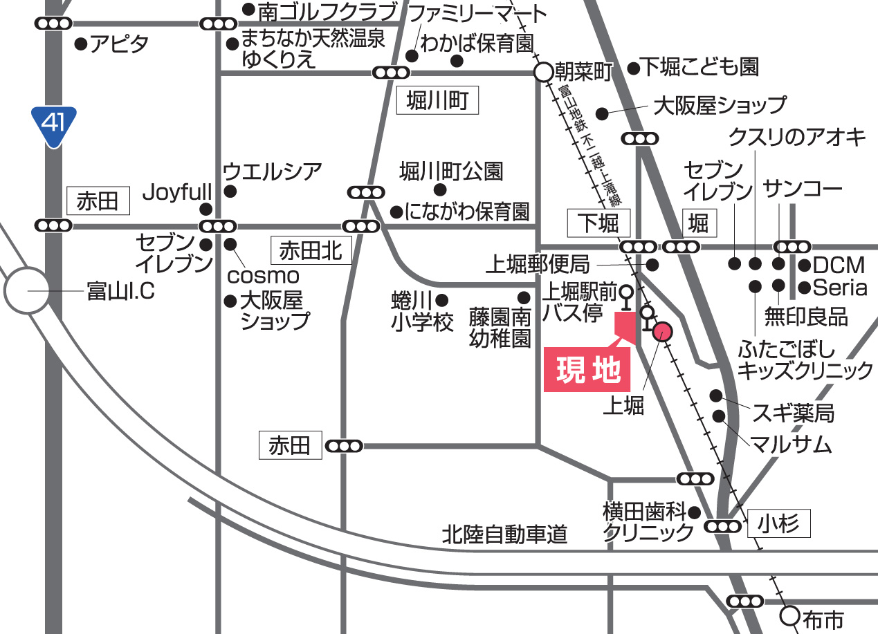 所在地 | 富山市堀字中筬割16番1外11筆(クローバータウン上堀7号地、12号地) | 交通 | 富山地方鉄道上堀駅より徒歩2分 |