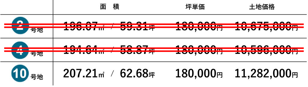 ・別途、以下の負担金が掛かります。2号地:464,650円、4号地:464,050円、10号地:469,320円