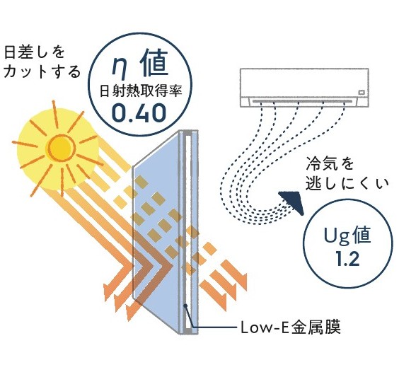 特に東西面の窓には、日射を反射するタイプのガラスが有効です。断熱性能も高く、省エネに貢献します。 -