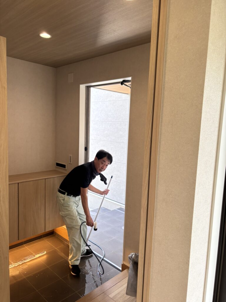 8日の午後からはスタッフ全員で分担し、モデルハウスや事務所の窓拭き、床掃除、見本カタログの整理までしっかりと。