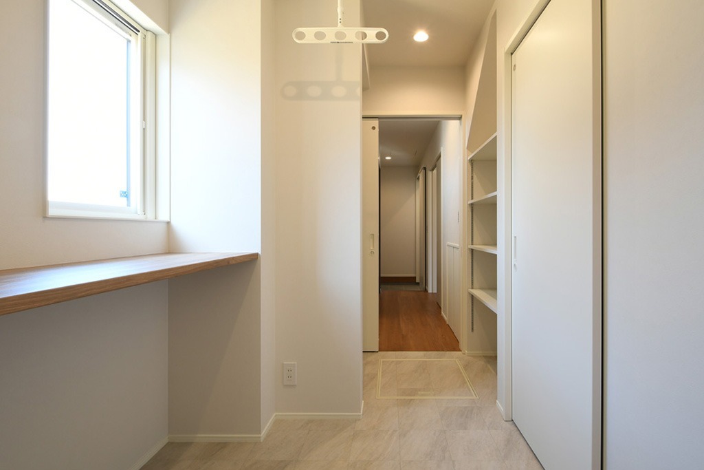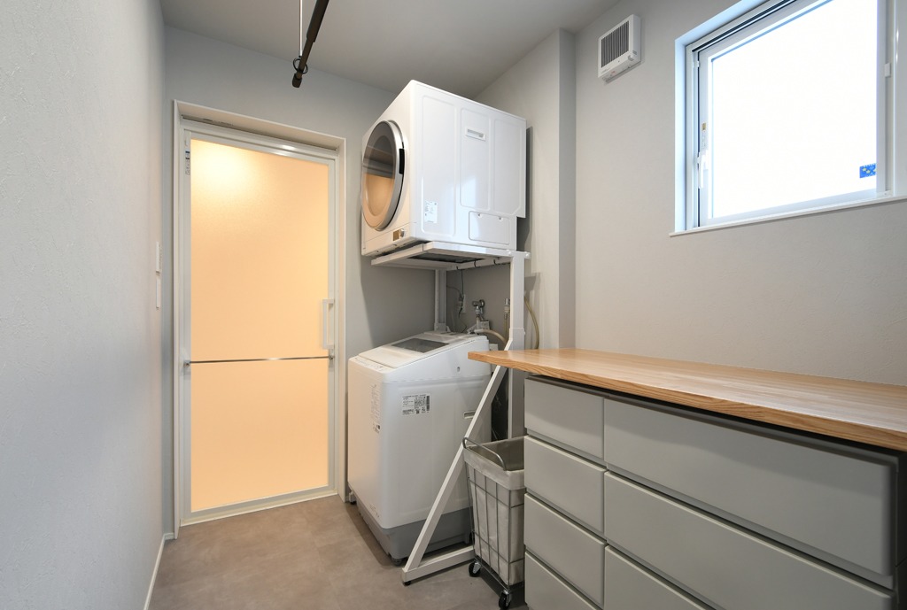 収納と作業台を設け、洗濯~乾燥~アイロンなどの家事を一手にこのスペースで完結できます。