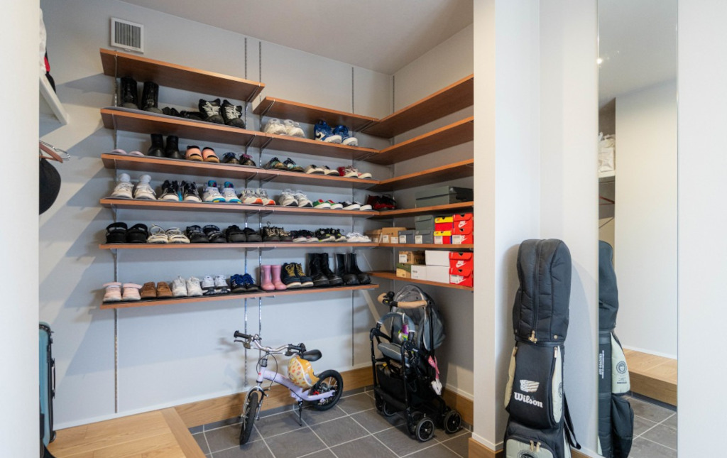 玄関ユニット収納は設けず、オープンな可動棚を壁面に設け、十分な収納量を確保した例です。