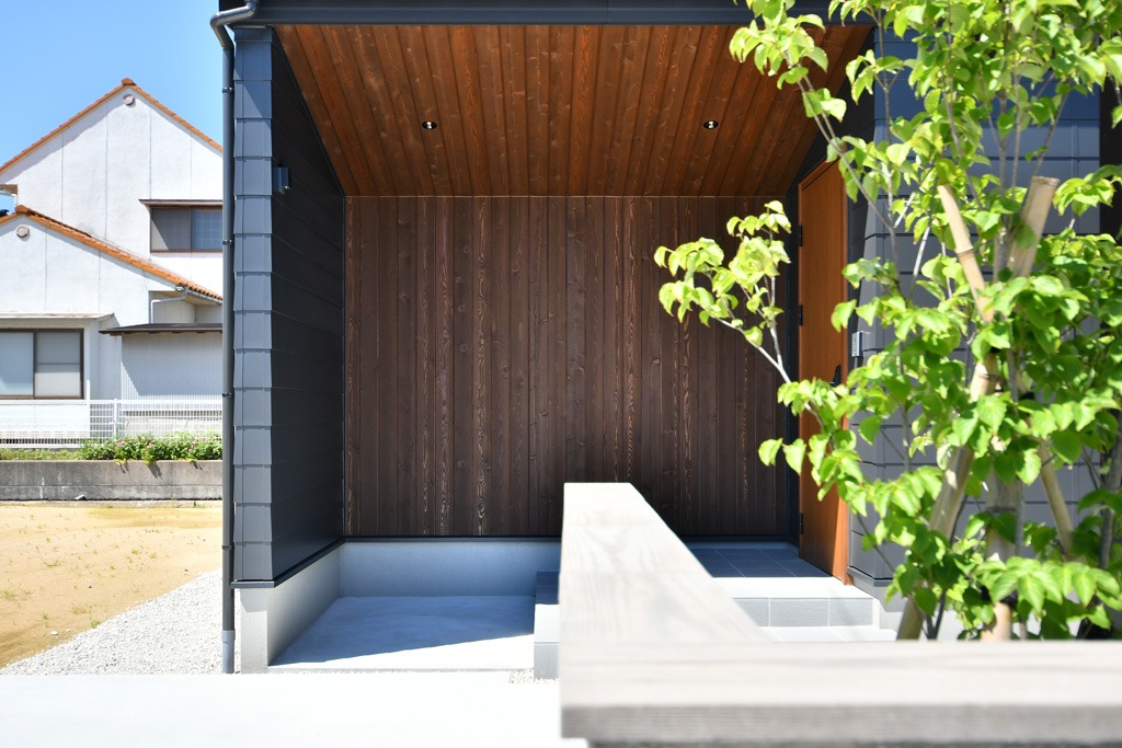 無垢板張りがアクセントの玄関ポーチには、